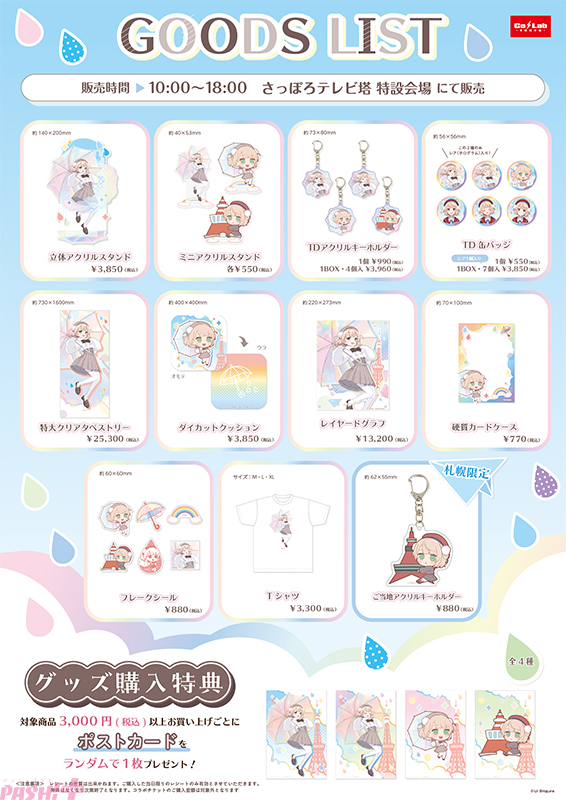 さっぽろテレビ塔特設会場では、本イベントの為に描き下ろしたイラスト等を使用したコラボグッズが販売されます。札幌会場限定【ご当地アクリルキーホルダー】も登場。開催期間中は1会計3,000円(税込)購入毎に、描き下ろしイラスト&描き起こしミニキャラの【特典ポストカード】全4種をランダムで1枚プレゼントします。