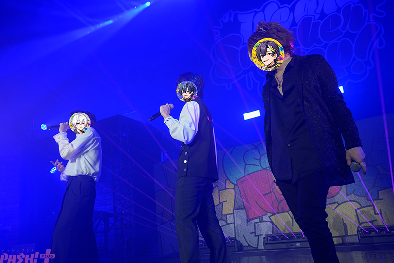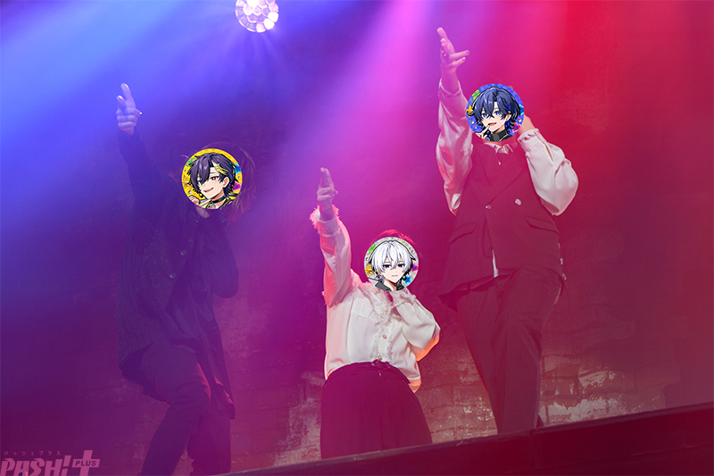 にしき、だいきり、たちばなの3名によるユニット『COOL組』がステージ上段に登場。「MΞLLOW FΞLLOW」は、3人のイケボを活かしたセクシーな曲。セリフ、ハーモニーやユニゾン、モノトーン衣装にぴったりのセクシーなコレオ、手を差し伸べるようなしぐさ……と次々に繰り出されるパフォーマンスは、アダルトな魅力が満載だ。「III」(原曲:hololive/宝鐘マリン&こぼ・かなえる)のカバーも披露。大人っぽい歌声と、クールなパフォーマンスで盛り上げた。