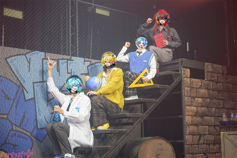 チャイムの音で始まった「がっこう戦争」を披露したのは、やなと、らお、ゆたくん、おさでいの4名によるユニット『POP組』。MVとリンクした衣装や小道具がかわいらしく楽しい空気を演出。コミカルな掛け合いや、背中合わせでくるくる回るフォーメーションダンスなど、ミュージカルのように4人のキャラクター性が存分に活かされたステージとなった。「ダンスロボットダンス」(原曲:ナユタン星人)のカバーでは、ロボットをイメージした振り付けと、ハイテンポで強めのボーカルのギャップが魅力的。最後の決めポーズのまま退場するまでキュートさを爆発させた。