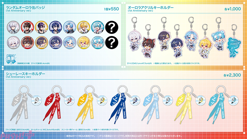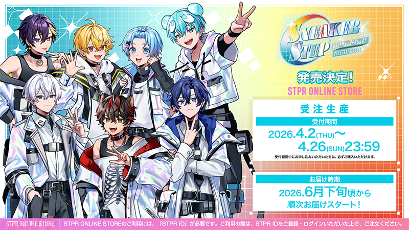 1周年を記念して描き下ろされた新ビジュアルを使用したランダムオーロラ缶バッジなどに加え、「すにすて」ならではのアイテムとして、靴紐とチャームがセットになった「シューレースキーホルダー」が登場します。さらに、メンバー全員をそろえて飾ることができるジオラマタイプのアクリルスタンドもラインナップ。各パーツは従来のアクリルスタンドとほぼ同サイズのため、7人を並べて飾ることで圧巻のビジュアルを楽しめます。これらの記念グッズは、STPR ONLINE STOREにて受注販売が開始されています。