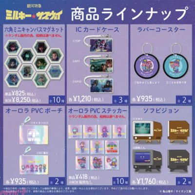 大人気『銀河特急 ミルキー☆サブウェイ』の各キャラクター、シーン等をデザインした 各キャラクターグッズを発売。銀河をイメージしたオーロラ、ラメ入り商品などを用意!