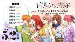 PASH! PLUS 『五等分の花嫁』スペシャルイベント「五等分の花嫁 SPECIAL EVENT 2026 in TOYOTA ARENA TOKYO」五つ子キャストの最新集合カットが特別公開” チケット特別先行受付もスタート 2026年5月2日(土)に開催される「五等分の花嫁 SPECIAL EVENT 2026 in TOYOTA ARENA TOKYO」。本日17:00より公演チケットの「五等分の花嫁 記念日」特別先行受付がスタートしました。 今回は... 2025.10.20 PASH! PLUS