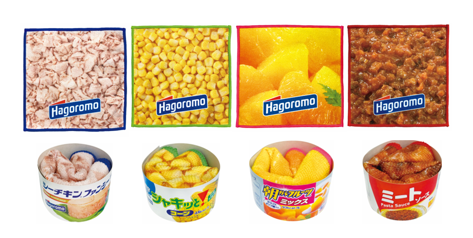「シーチキン」、「シャキッと!コーン」、「朝からフルーツ」、「ミートソース」の中身がデザインされたハンドタオル。全4種類。縦約20cm×横約20cm。