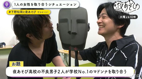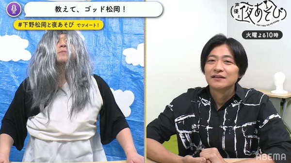 4月28日は、『声優と夜あそび 火【下野紘×松岡禎丞】 特別編 #2』と題し、体調不良のため欠席となった内田真礼さんに代わり、代理MC として松岡禎丞さんが出演。松岡さんがさまざまな質問に答える「教えて!ゴッド松岡」や、シチュエーションに対する2 人の答えを視聴者がジャッジする「乙女心わかってる!?クイズ」、ダミーヘッドマイクで“女性をとりあう”シチュエーションを演じる「ダミヘ企画!俺の女になれ!」など、さまざまなコーナーを行ないました。