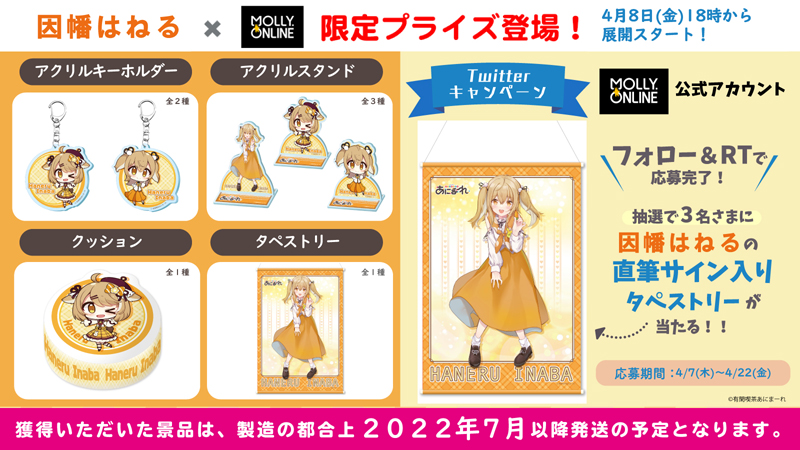 “因幡はねる”限定プライズの展開を記念し、モーリーオンライン公式Twitterではフォロー&リツイートで“因幡はねる”のサイン入りタペストリー”が3名に当たるTwitterキャンペーンを開始いたします。