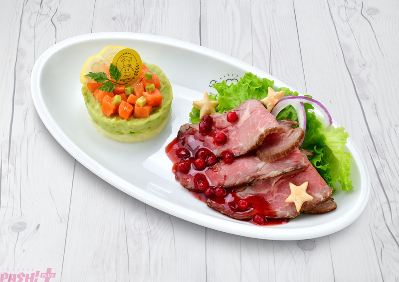 ローストビーフは甘酸っぱいリンゴンベリーのソースをアクセントに。アボカドペーストとマッシュポテトのサラダケーキには、サーモンをたっぷりと添えて。