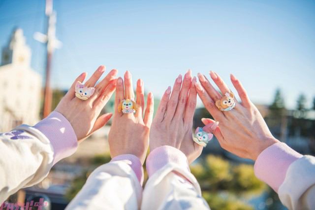 リングは全部で5種類あり、どのデザインが入っているかは箱を開けてからのお楽しみです。そのほか、たくさんのお花とチョウがあしらわれたリーナ・ベルのカチューシャや、春のお出かけにぴったりなパーカーを着たダッフィー&フレンズのぬいぐるみバッジを販売します。