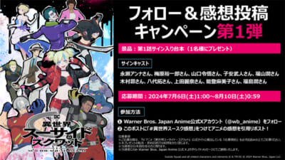 TVアニメ『異世界スーサイド・スクワッド』の放送を記念して、X(旧Twitter)にて感想投稿キャンペーン第1弾を開催。応募方法はWarner Bros. Japan Anime 公式Xをフォローの上、応募用ポストに作品の感想と指定ハッシュタグ「#異世界スースク感想」をつけ、引用リポストすれば応募完了です。