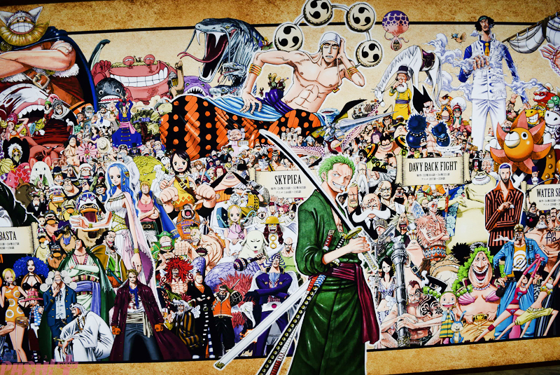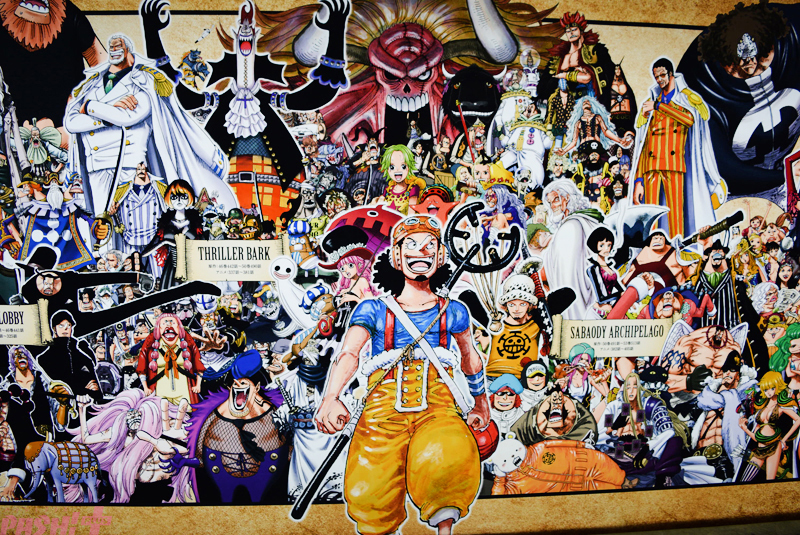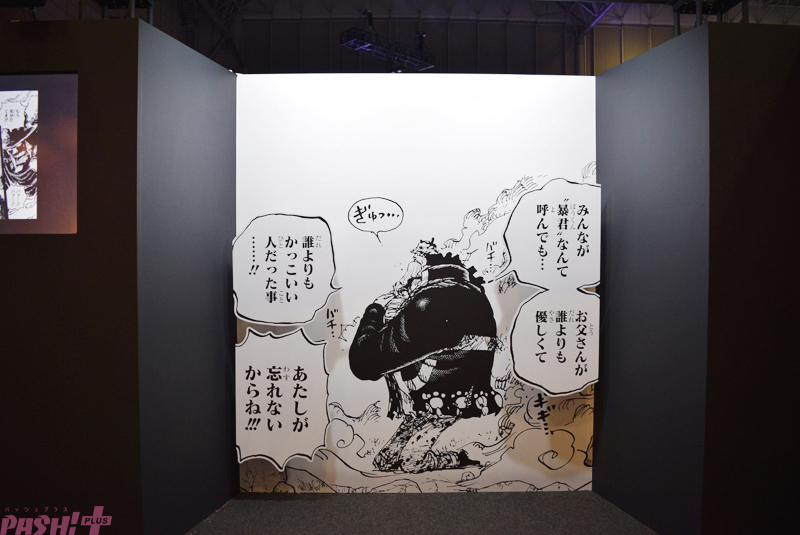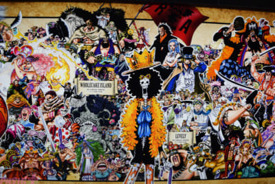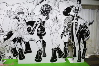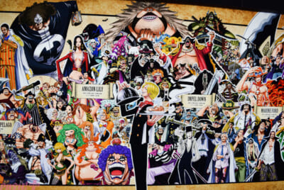 ルフィたちが歩んできた歴史と出会ったキャラクターたちを振り返ることができる巨大壁面グラフィックは会場壁沿いの三分の一ほどを占める大迫力! 大多数のキャラクターたちの姿に、物語を振り返ることもできる展示となっています。