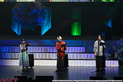 開幕から来場者のテンションも高い本イベント最初のコーナーは朗読劇。初音ミク(ORIGINAL CV BY:藤田咲)、鏡音リン(ORIGINAL CV BY:下田麻美)、鏡音レン(ORIGINAL CV BY:下田麻美)の3人がみんなの様子を見に行く……という形で始まります。まずステージに現れたのは本泉莉奈さん、今井文也さん、伊東健人さん、土岐隼一さんの4人。迷っていた日野森雫を東雲彰人、青柳冬弥、神代類の3人が案内していた模様で、雫が3人について「絶妙な関係なのね~」と絶妙な言い回しで表現すると会場からも笑い声が上がります。