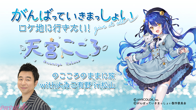 映像を飾るのは、バーチャルライバーグループ「にじさんじ」に所属し、YouTubeチャンネル総再生回数1億4000万回以上を誇る人気VTuber・天宮こころ。そして、実際に劇場アニメーション『がんばっていきまっしょい』のロケ地・舞台となった愛媛県 松山市を巡るのは、これまで数多くのTV番組に出演し、現在自身でもYouTubeチャンネルを持ち、幅広く分野で活動する、芸人よゐこ・有野晋哉さん。VTuberと芸人の二人が、愛媛県_松山市の名所や作品ロケ地を盛りだくさんに巡る様子が映し出されています。