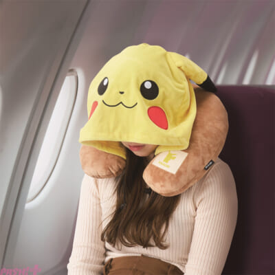 フードをかぶるとピカチュウ・ヤドン・カビゴンになりきれるフード付ネックピローです。顔を隠すフードカバーが付いているので機内で周りを気にせずゆっくり休めます。フリース素材が気持ちよくふかふかなので、長時間の移動も快適に過ごせます。スーツケースに乗せてもかわいい!