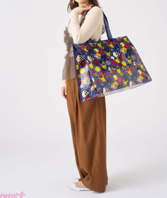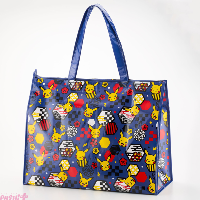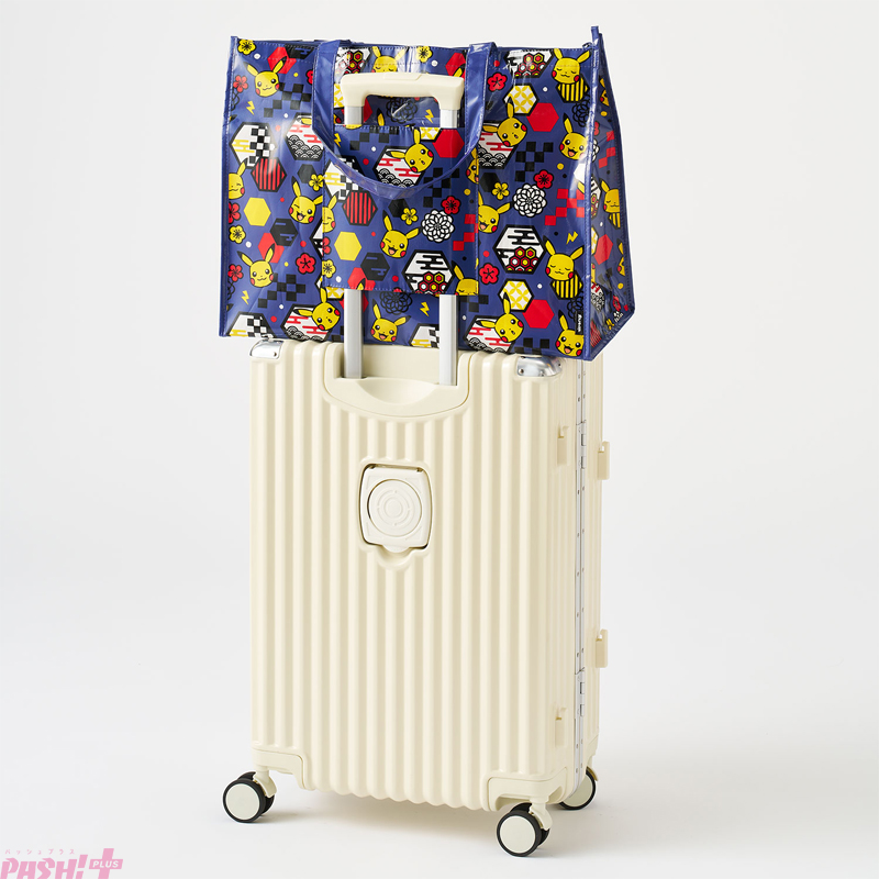 和柄のピカチュウがデザインされたお土産バッグ。100席以上の機内持ち込み対応サイズです。スーツケースのキャリーバーにセットできるので楽に持ち運べます。ファスナー部分に南京錠を付けられるので旅先でも安心!