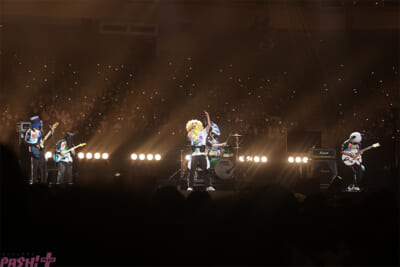 コント終了後の転換では、スマイルとBroooockが登場すると、観客とコミュニケーションしながら、ゆるいフリートークが行われました。準備が整い、2人からの「どうぞ!」というかけ声でメンバー演奏による『夜市(GOODWARP)』のイントロが流れ出しました。たちまち手拍子と歓声が上がり、きりやんが歌いだすと、炎の演出も相まって会場の熱量は急上昇しました。