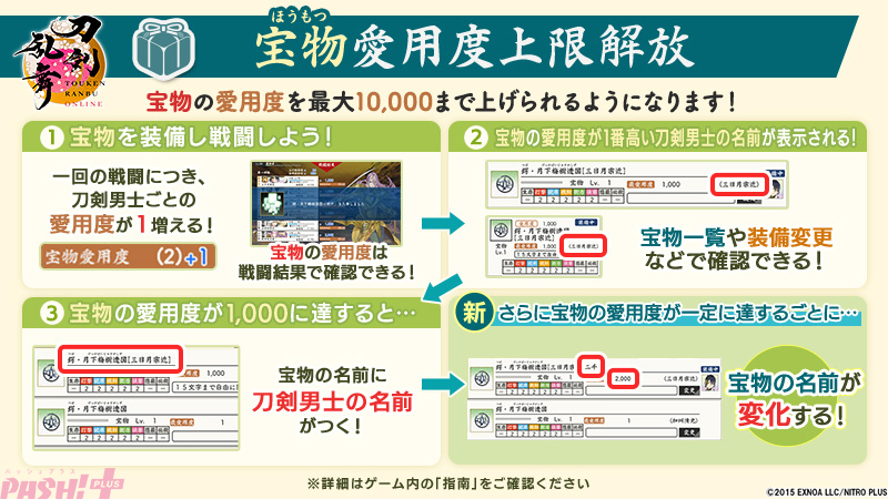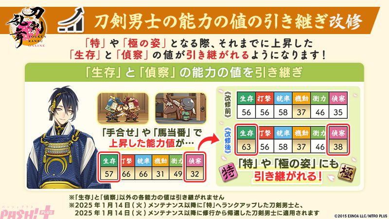 2025年1月14日(火)のメンテナンスにて、刀剣男士が「特」へランクアップする際や「極の姿」となる際に、それまでに上昇した「生存」と「偵察」の能力の値が引き継がれるように改修しました。