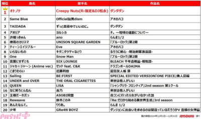 なかでも5位『ドラゴンボールDAIMA」の主題歌のゼッド feat. C&K「ジャカ☆ジャ~ン (Anime ver.)」は12月15日にカラオケ配信されてたった半月で11位に急上昇を遂げるという、驚異的な人気を示しました。