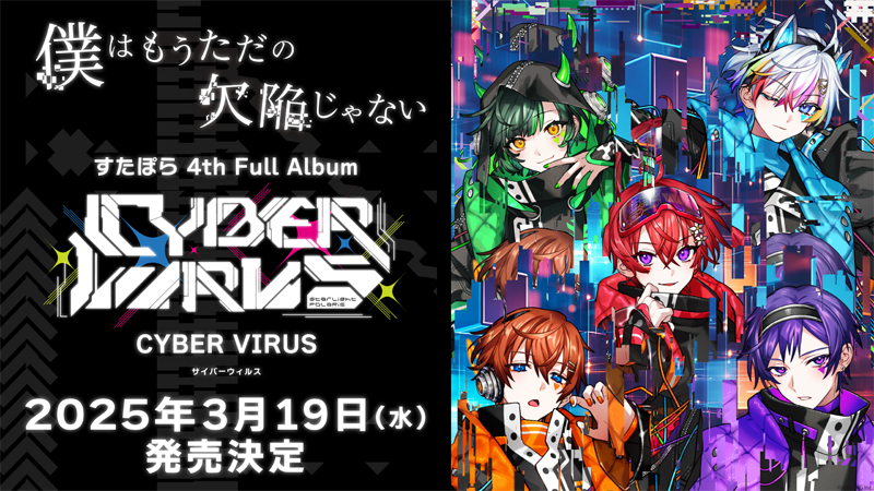 VOISING所属の実力派5人組歌い手グループ「すたぽら」のワンマンライブ「すたぽら 2025 One Man Live 【緊急クエスト】クソゲーな人生を神ゲーに!?春の東西ライブを全クリせよ!」が4月5日(土)に大阪・4月26日(土)27日(日)に東京にて開催されることが発表。さらに、3月19日(水)には待望のすたぽら4枚目となるアルバム『CYBER VIRUS』の発売も決定しました。