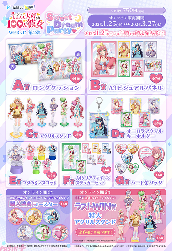 ディ・テクノは2025年1月25日(土)より、「君のことが大大大大大好きな100人の彼女 WEBくじ第2弾『Sweet Dream Party(ハート)』」の販売を開始しました。