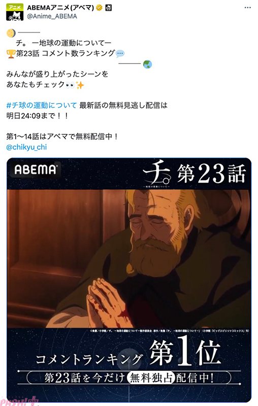 ABEMAは、ABEMAアニメチャンネル公式X(旧Twitter)にて『チ。 ―地球の運動について―』第23話「同じ時代を作った仲間」放送時のコメント最多シーンTOP3を発表しました。