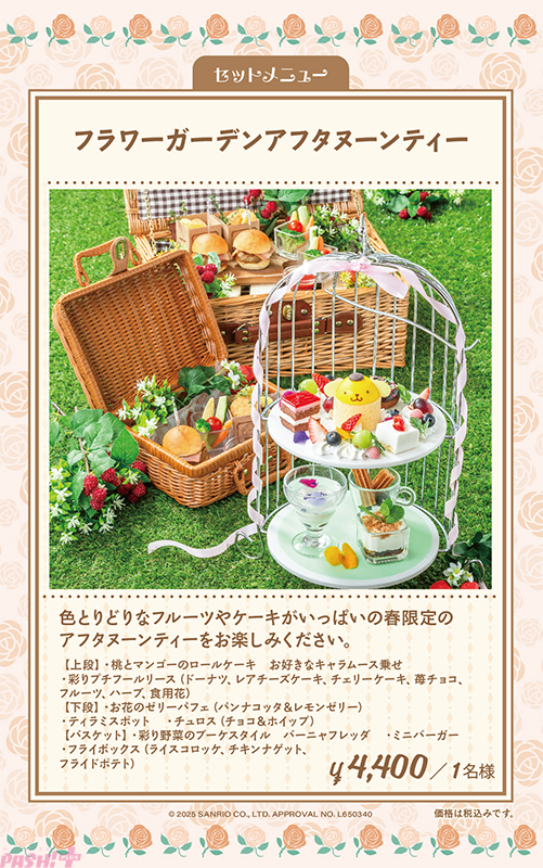 サンリオキャラクターズ ガーデンカフェの大人気メニュー、季節のアフタヌーンティー。今回は色とりどりのフルーツやケーキがいっぱいの「フラワーガーデンアフタヌーンティー」です。