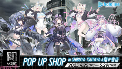 SHIBUYA TSUTAYA IP書店とデザインココが、SHIBUYA TSUTAYAのリニューアルオープン1周年とIP書店のオープン1周年を記念して立ち上げた新規ブランド「AXGRIT(アクスグリット)」のプロジェクト第1弾として、カバーが運営する「ホロライブプロダクション」所属の「ホロライブEnglish -Advent-」のPOP UP SHOPを2025年4月25日(金)よりSHIBUYA TSUTAYA 6F IP書店にて開催します。