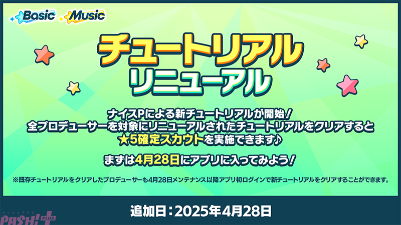 大型アップデートを機に、チュートリアルがリニューアル! ナイスPによる新チュートリアルをクリアすると★5確定スカウトを実施できます。