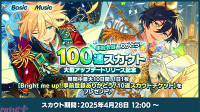 期間中最大10日間、1日1枚【Bright me up!!事前登録ありがとう!10連スカウトチケット】をプレゼントします。さらに、10日目には★5カードが1枚以上確定の【Bright me up!!事前登録ありがとう!★5確定10連スカウトチケット】をプレゼント! 合計で100連分の無料スカウトチケット(内、★5カード1枚以上確定)が入手できます。