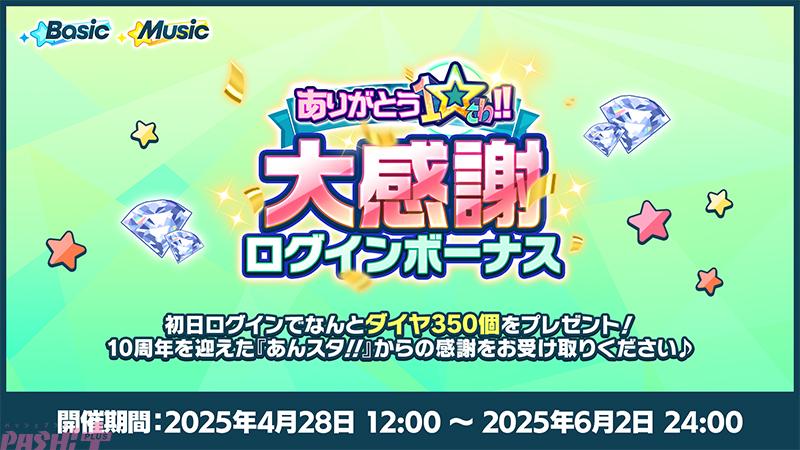 初日ログインでダイヤ350個をプレゼント! 10周年を迎えた『あんスタ!!』からの感謝をお受け取りください。