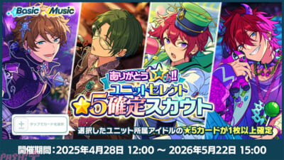 選択したユニット所属アイドルの★5カードが1枚以上確定で獲得できる10連スカウトを開催! 全15ユニットの中から、1ユニットを選択できます。1人1回まで、有償300ダイヤでスカウトを行えます。