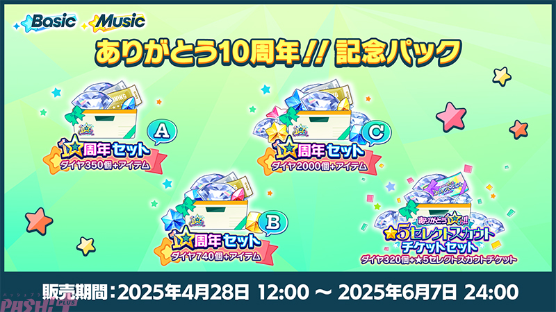 4種類の10周年記念ダイヤパックを販売します。選択した★5カードが1枚確定で手に入る「ありがとう10周年!!★5セレクトスカウト」が行える「ありがとう10周年!!★5セレクトスカウトチケット」付きのセットや、通常の購入と比べて、大幅に増量したおまけダイヤと育成アイテムがセットになったお得なパックとなっています。