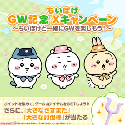 アプリボットが企画・制作・開発・運営を行う、スマホアプリ『ちいかわぽけっと(ちいぽけ)』の公式X(旧Twitter)にて、「大きなさすまた」や「大きな討伐棒」が当たる「ちいぽけGW記念 Xキャンペーン ~ちいぽけと一緒にGWを楽しもう!~」が開催中です。