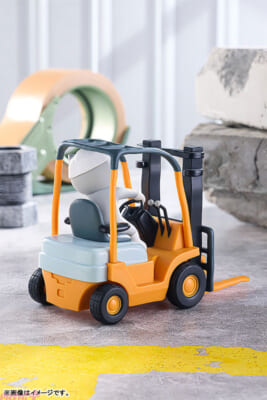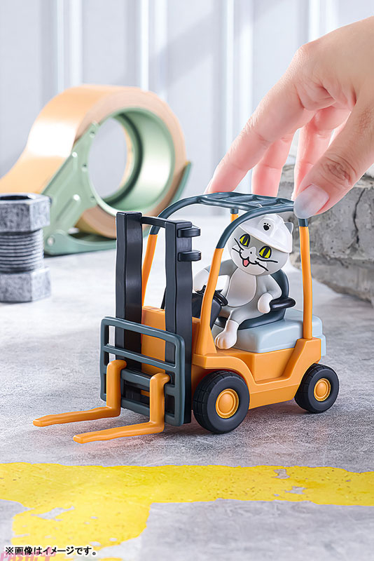 くまみね先生の描き下ろしイラストを元にしたフォークリフトに乗った仕事猫が、後ろに引いて手を離すと走り出します。ヨシ! シートベルトや爪の向きなど、実際のフォークリフトを運転する際の注意と比べてみるのもオススメ……かも?