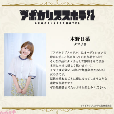 The post アニメ『アポカリプスホテル』追加キャスト情報解禁! 強面宇宙人役に津田健次郎さん、タマ子役に木野日菜さんが決定 first appeared on PASH! PLUS.