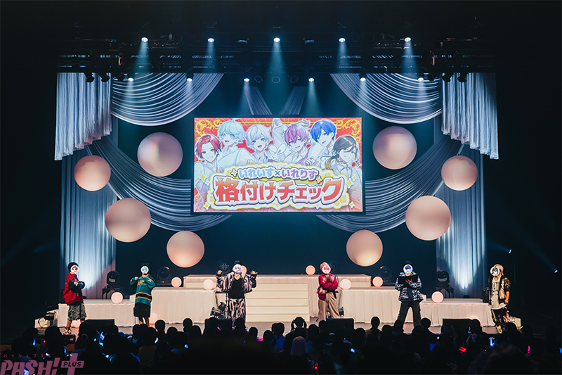 第2部のメイン企画として実施されたのが、某人気テレビ番組をオマージュしたチーム対抗のパロディゲーム「いれいす×いれりす 格付けチェック」。普段のライブや配信とは一線を画す内容に、ファンの期待も高まります。普段は、リーダーのないこが司会進行を務めておりますが、この日の司会進行はイベント特別仕様としてIfが担当。軽快なトークと進行でイベントを盛り上げました。