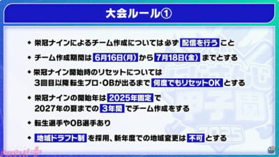その他にも、トーナメント表の組み分けは直前番組によって決定することや、2年目までの育成データを使用可能な練習試合の実施、ライブビューイングの開催なども発表されました。