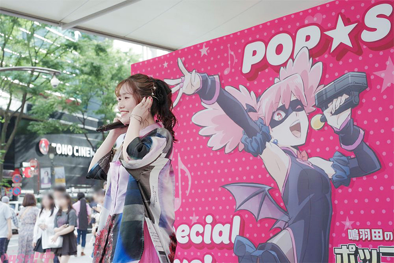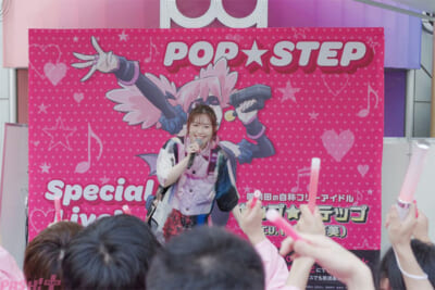 本作のクライマックスの放送が迫る中、ポップ☆ステップ(CV:長谷川育美)のゲリラライブが渋谷にて決行。多くのファンが応援に駆け付ける中、伸びやかな歌声でキャラクターソングを熱唱し、会場が熱気に包まれました。