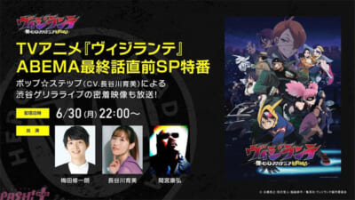 また、最終話の放送日となる6月30日(月)22時より、ABEMAにて「TVアニメ『ヴィジランテ』最終話直前特番」の配信が決定! 今回のゲリラライブを密着映像で綴ったスペシャル映像も特番で公開となります。さらに、同日6月30日に最終話放送、特番配信と合わせてABEMAにて無料一挙配信も実施されます。