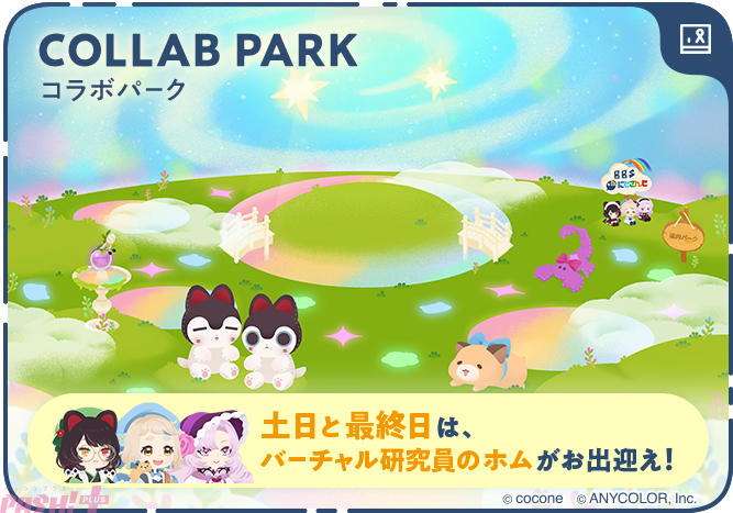 アプリ内でほかの飼い主さまやリヴリーと一緒に集まることができる「おさんぽストリート」を、期間中、特別な飾り付けで彩ります。「コラボパーク」では、土日と最終日にライバー3名のアバターとリヴリーが登場し、記念撮影などを行うことができます。