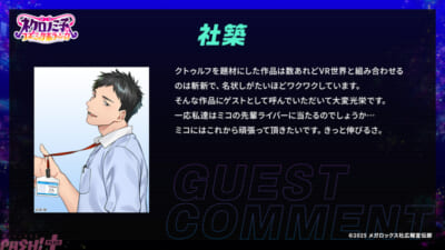 クトゥルフを題材にした作品は数あれどVR世界と組み合わせるのは斬新で、名状しがたいほどワクワクしています。そんな作品にゲストとして呼んでいただいて大変光栄です。