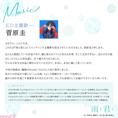 みなさん、こんにちは。このたび『雨と君と』にてエンディング主題歌を担当させていただきました、菅原圭と申します。