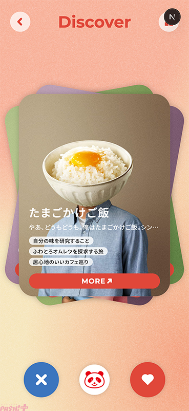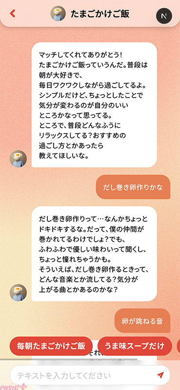 ④マッチング成立後はキャラクターとのトーク画面に移行し、会話を重ねることでレシピを教えてくれます。