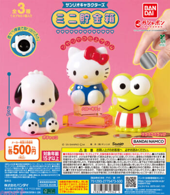 バンダイ ベンダー事業部は、サンリオのキャラクター達をラインアップした、実際に硬貨を入れて使用できるミニ貯金箱『サンリオキャラクターズ ミニ貯金箱』(1回500円・税10%込、全3種)を2025年6月第2週より全国のガシャポンバンダイオフィシャルショップ、玩具売場、量販店、家電店などに設置されたガシャポン自販機シリーズにて発売しました。