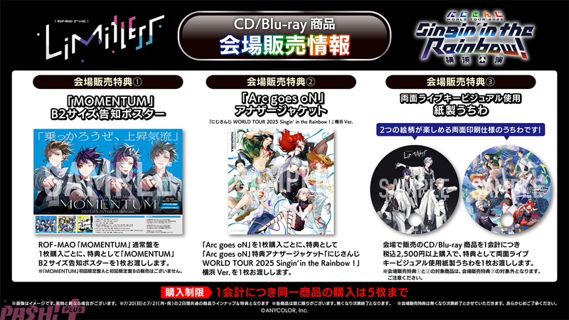 ANYCOLORが運営するバーチャルライバーグループ「にじさんじ」所属のライバーによる、Kアリーナ横浜『ROF-MAO 2nd LIVE – Limitless』『にじさんじ WORLD TOUR 2025 Singin’ in the Rainbow! 横浜公演』の2公演にてCD/Blu-ray商品の会場販売を実施します。