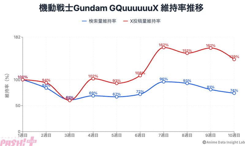 X投稿量維持率139%、検索量維持率74%の『機動戦士Gundam GQuuuuuuX』は、大型IPならではの特徴的な推移を示しました。