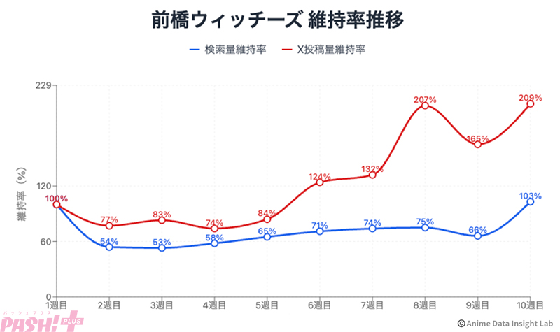 X投稿量維持率209%、検索量維持率103%を記録した『前橋ウィッチーズ』は、継続的なSNS話題拡散で成功した代表例といえます。