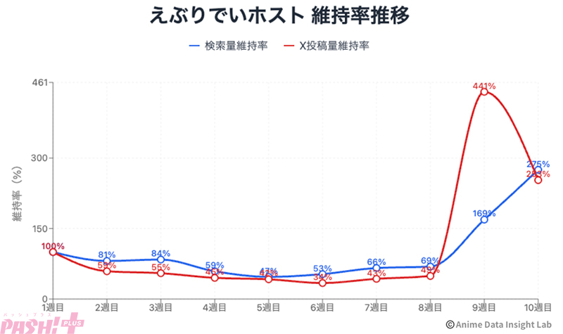 『えぶりでいホスト』の事例が示すように、8週目まで低迷していた作品が特定エピソード(7話)のバズをきっかけに9週目に急激に注目度を爆発させるパターンが出現しています。特に同作品は9週目にX投稿量維持率が441%まで急騰しており、SNSでの爆発的な話題拡散が検索量の275%成長を後押ししています。