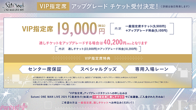 ※「スペシャルグッズ付き指定席」アップグレードチケットへの申し込みはSatomi ONE MAN LIVE 2025 FC最速先行(抽選)の「指定席」でご当選後、ご入金された方のみ。