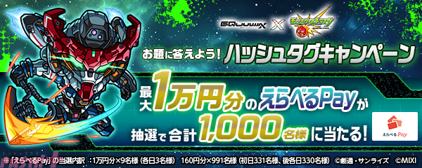 さらに、抽選で「えらべる PayR」が当たるキャンペーンも実施します。加えて、本コラボでは『機動戦士 Gundam GQuuuuuuX』の主題歌である米津玄師さんの楽曲「Plazma」を、ゲーム内(タイトル/クライマックス)およびモンストニュースのBGMとして使用しているほか、その他の作中劇伴曲も随所で活用しており、コラボの世界観を一層盛り上げます。本コラボの詳細については、モンスト公式サイト内のお知らせをご確認ください。