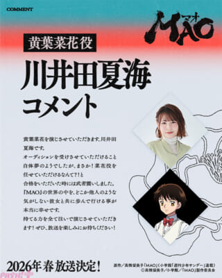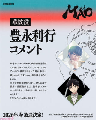 『MAO』の世界の中を、どこか他人のような気がしない彼女と共に歩んで行ける事が本当に幸せです。持てる力を全て注いで演じさせていただきます! ぜひ、放送を楽しみにお待ちください!