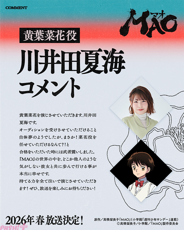 The post 高橋留美子さんの最新作『MAO』がTVアニメ化決定! アニメーション制作は『犬夜叉』のサンライズが担当 first appeared on PASH! PLUS.